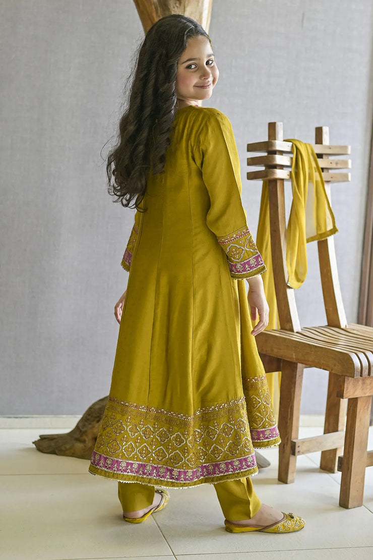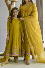 Detail Opulent long frock style outfit in mustard hues. Features luxury embroidered viscose, highlighted with signature Rafia embellishments. Complemented with matching trouser and embroidered dupatta.